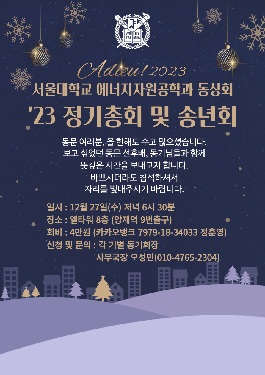서울대학교 에너지자원공학과 동창회 송년행사를 아래와 같이 개최합니다. 동문으로서의 자긍심과 새로운 각오를 함께 다지는 자리가 될 수 있도록 꼭 참석해주시기 바랍니다. • 일시: 2013년 12월 6일(금) 저녁 6시 30분 • 장소: 서울대 공과대학 38동 B1 락구정 다목적 홀 • 등록비: ...